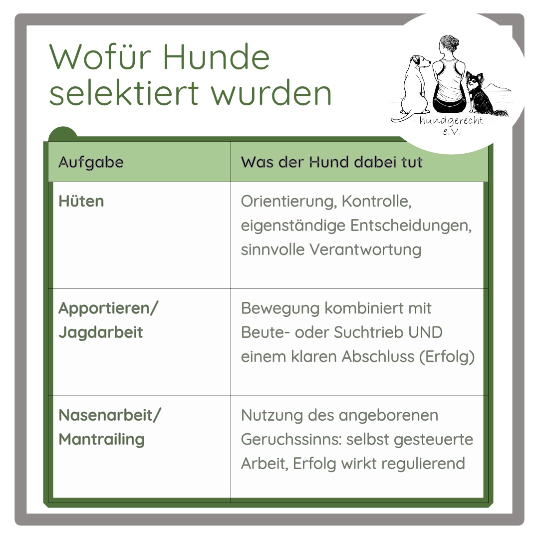 Hunde wurden über Jahrtausende für konkrete Aufgaben selektiert: Hüten, Jagen, Apportieren, Schutz oder Rettung. Bei diesen Tätigkeiten kann der Hund sein Können einsetzen, Entscheidungen treffen und direkten Einfluss auf das Ergebnis haben. Ein Hütehund zum Beispiel erlebt Abschluss, weil er die Schafe kontrolliert und sicher an ihr Ziel bringt. Er entscheidet selbst, wie er vorgeht, er ist selbstwirksam (ein Grundbedürfnis intelligenter sozialer Lebewesen)